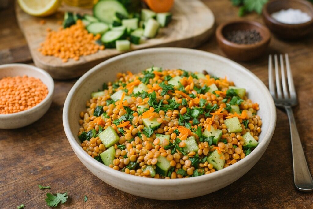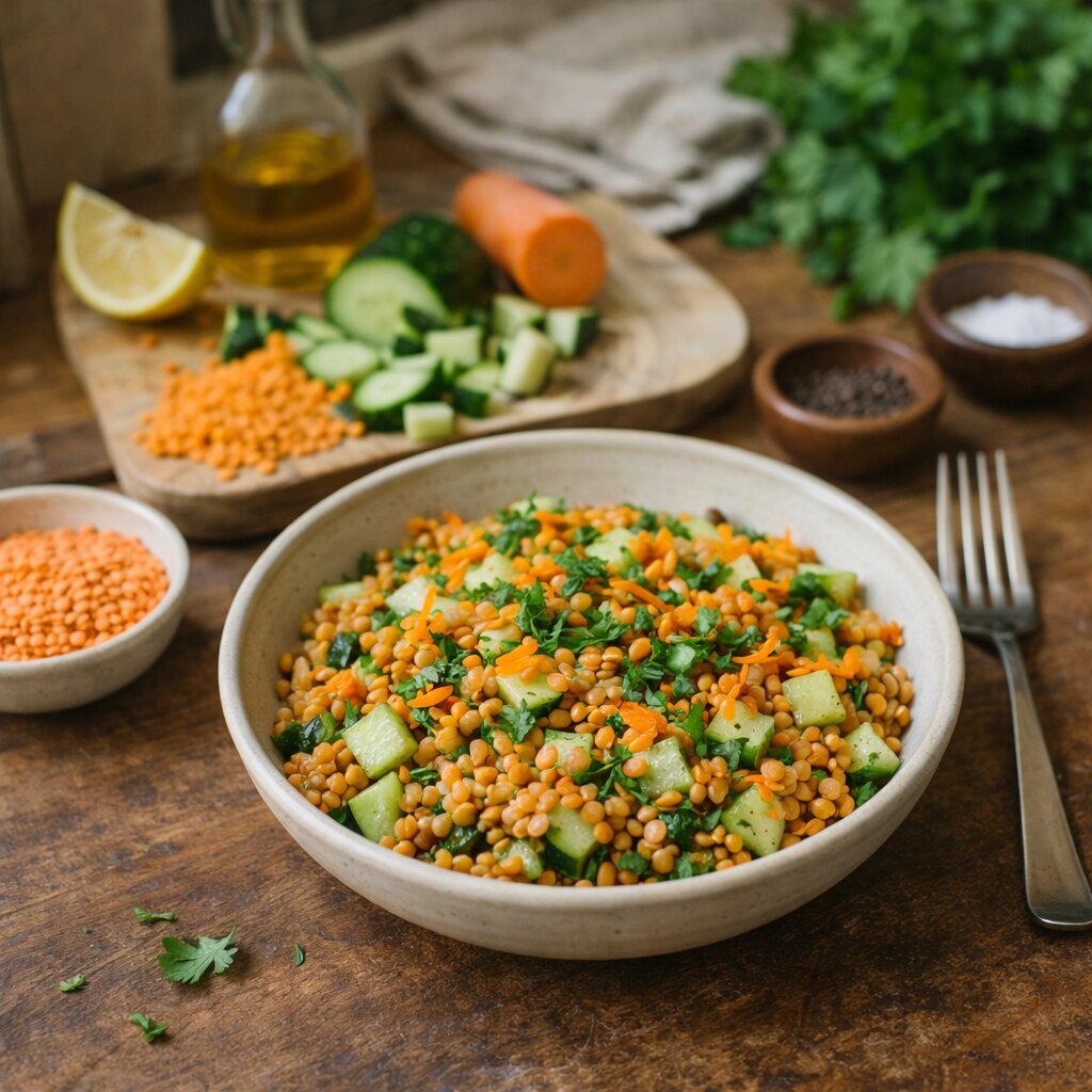 Spüle die Linsen gründlich und koche sie in Wasser, bis sie weich sind. Bleib vielleicht kurz in der Küche stehen, statt wegzugehen. Nimm wahr, wie etwas Einfaches entsteht, ohne Druck, ohne Perfektion.